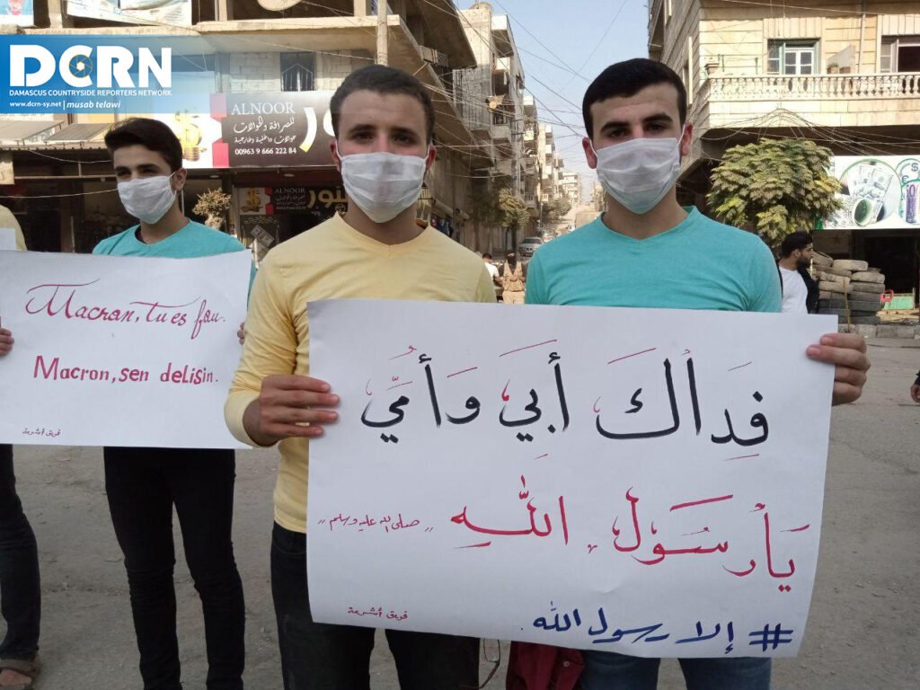 حيث شهدت ساحات عفرين شمالي حلب مظاهرات عارمة طالبت بالوقوف في وجه الحملة التي يشنها رئيس الوزراء الفرنسي ضد الإسلام والمسلمين.