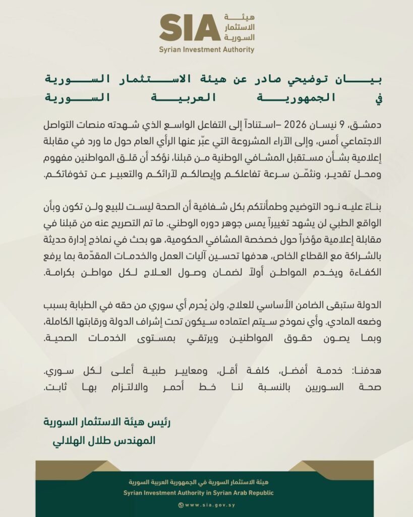 هذه التصريحات “المثيرة للجدل” دفعت هيئة الاستثمار إلى إصدار بيان توضيحي نفت فيه نية الحكومة خصخصة القطاع الصحي، مؤكدة أن الصحة السورية ليست للبيع ولن تكون.