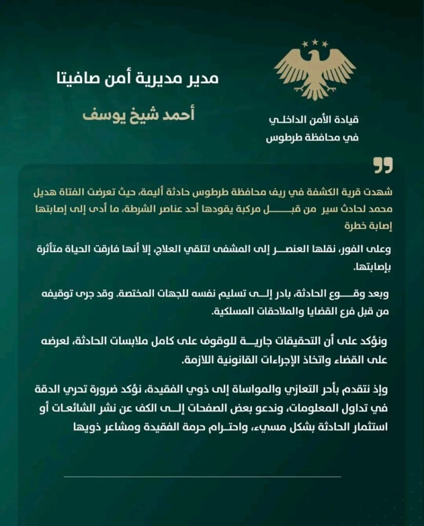“شهدت قرية الكشفة في ريف محافظة طرطوس حادثة أليمة، حيث تعرضت الفتاة هديل محمد لحادث سير من قبل مركبة يقودها أحد عناصر الشرطة، ما أدى إلى إصابتها إصابة خطرة.