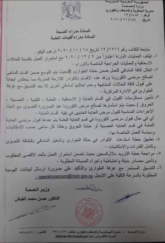 و جاء في القرار إيقاف العمليات الباردة مع استمرار الحالات الاسعافية وعمليات الأورام الخبيثة، وانتقال كافة المشافي إلى خطة الطوارئ ليتم التوسع لاستقبال عدد أكبر من المصابين بالفيروس.