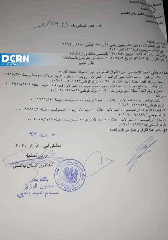 أصدر وزير المالية التابع لحكومة نظام الأسد قراراً يقضي بالحجز الاحتياطي على الأموال المنقولة و غير المنقولة العائدة لمحافظ ريف دمشق المهندس علاء منير ابراهيم و زوجته و أولاده، المعفي من مهامه يوم أمس بسبب قضايا فساد تتعلق به.