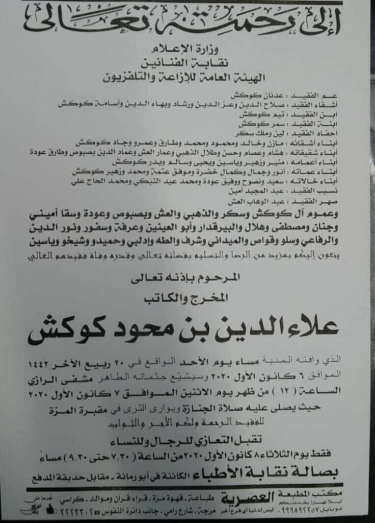 نعت وسائل الإعلام السورية الموالية والمعارضة لنظام الأسد المخرج علاء الدين كوكش صباح يوم الاثنين 7 ديسمبر للعام 2020 الجاري عن عمر يناهز 78 عاماً، دون الإعلان عن سبب وفاته في دار السعادة للمسنين بعد تهجيره من منزله في معضمية الشام.