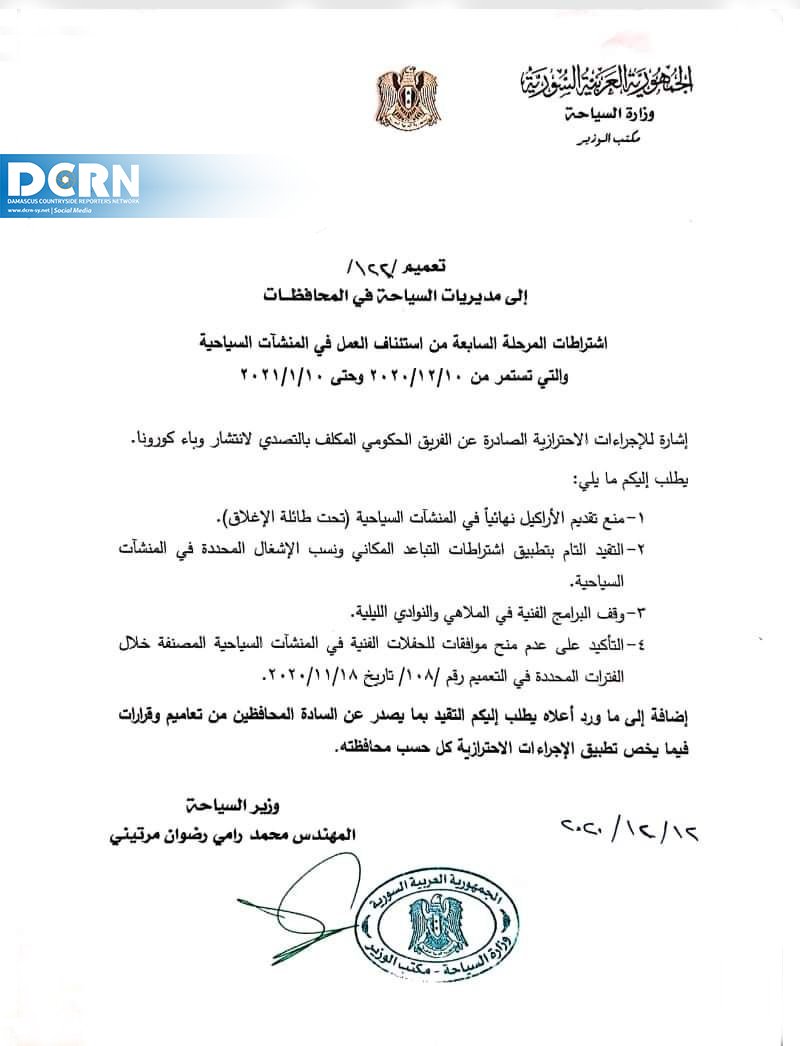 أصدرت وزارة السياحة في حكومة نظام الأسد تعميماً يقضي بمنع تقديم الأراكيلة (النرجيلة) نهائياً في المنشآت السياحية تحت طائلة الإغلاق، وإيقاف الملاهي والنوادي الليلية، كما شمل القرار بالتأكيد على عدم منح الموافقات للحفلات الفنية خلال الفترة المحددة من تاريخ 10/12/2020 وحتى 10/1/2021 للتخفيف من انتشار فيروس كورونا على حد تعبيرهم.