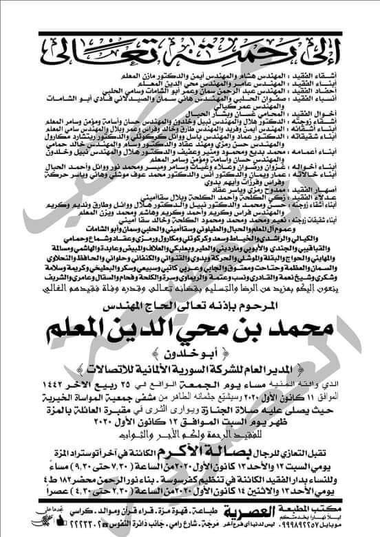 نعت عائلة المعلم في دمشق صباح أمس السبت 12 ديسمبر، وفاة “محمد محي الدين المعلم” شقيق وزير الخارجية السابق لنظام الأسد “وليد المعلم”، بعد صراع طويل مع المرض حسب وكالة “سانا” المؤيدة لنظام الأسد، على عكس ما تداوله ناشطون موالون للنظام لخبر وفاته بفيروس كورونا (كوفيد19) المستجد.