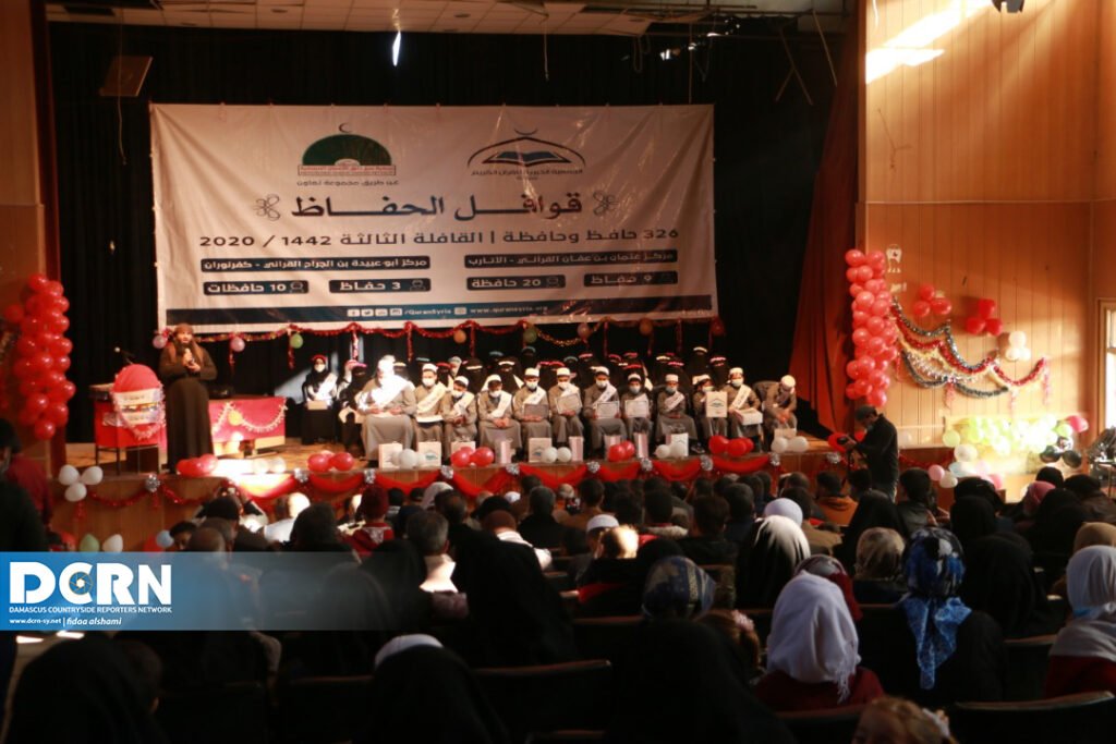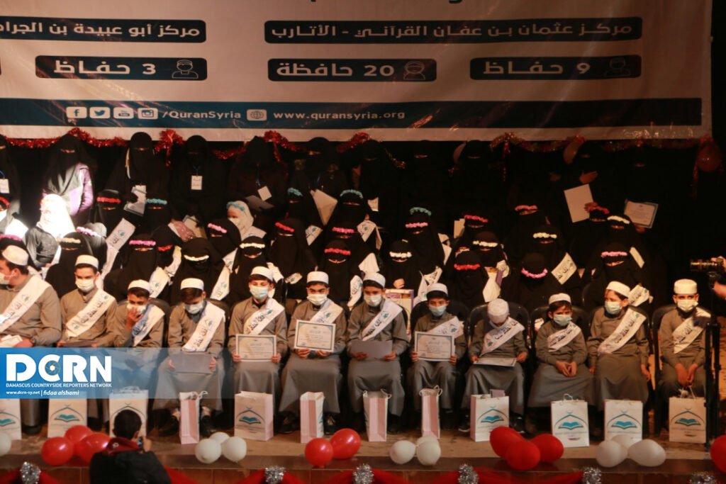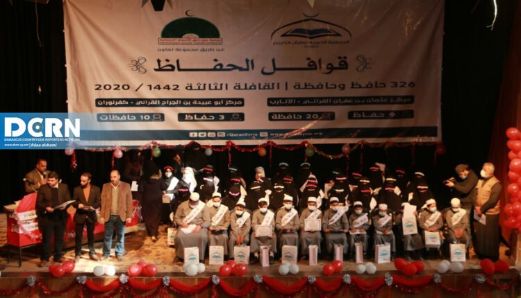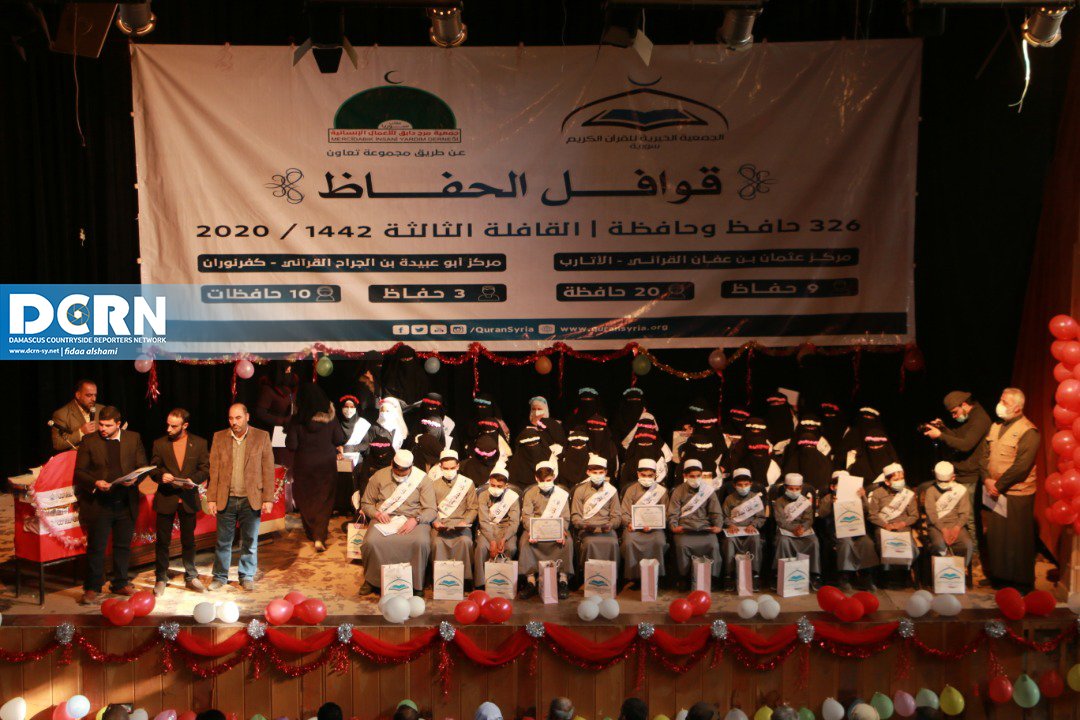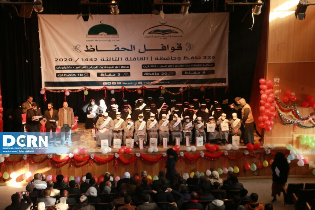 أقامت يوم أمس الجمعية الخيرية للقرآن الكريم حفل تخريج القافلة الثالثة من حافظي القرآن الكريم في الشمال السوري المحرر حيث أقيم الحفل في مدينة الأتارب غرب محافظة حلب والواقعة تحت سيطرة حكومة الإنقاذ، وبلغ عدد خريجي القافلة الثالثة 326 حافظاً وحافظة و لضمان الإجراءات الإحترازية بسبب جائحة كورونا تم تقسيم التخريج إلى عدة دفعات، بدأت في مركز عبد الله بن مسعود القرآني في دارة عزة حيث شمل التكريم 12 حافظاً و 18 حافظة ليكون الحفل الثاني في مركز أبي عبيدة بن الجراح القرآني في كفر نوران شمل 3 حفاظ و 10 حافظات آما الثالث تم تخريجه من مركز عثمان بن عفان القرآني في مدينة الآتارب شمل 9 حفاظ و 20 حافظة.