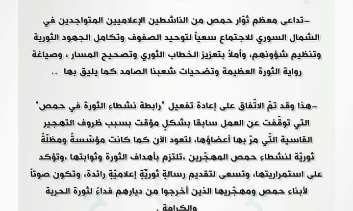 “تم الاتفاق على إعادة تفعيل “رابطة نشطاء الثورة في حمص” التي توقفت عن العمل سابقاً بشكل مؤقت بسبب ظروف التهجير القاسية التي مر بها أعضاؤها، لتعود الآن كما كانت مؤسسة ومظلّة ثورية لنشطاء حمص المهجرين، تلتزم بأهداف الثورة وثوابتها، وتؤكد على استمراريتها، وتسعى لتقديم رسالة ثورية إعلامية رائدة، وتكون صوتاً لأبناء حمص ومهجريها الذين أخرجوا من ديارهم فداء لثورة الحرية والكرامة”.