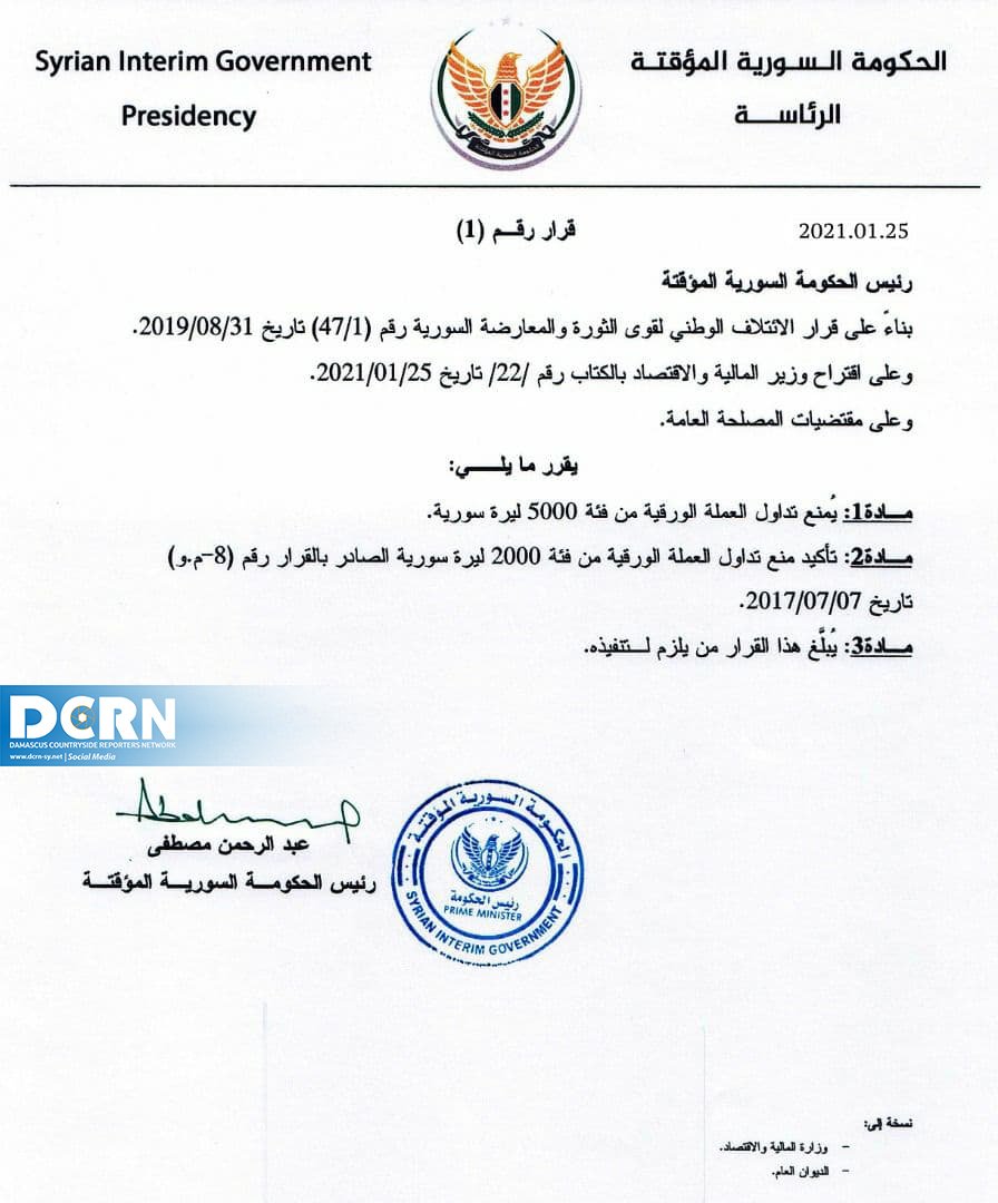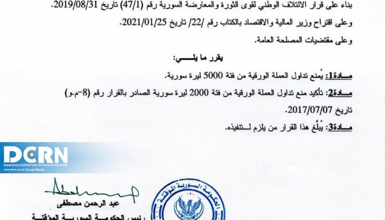أصدرت الحكومة السورية المؤقتة قراراً يقضي بمنع تداول الفئة النقدية الجديدة بقيمة 5000 ليرة سورية التي طرحها البنك المركزي لدى نظام الأسد مطلع العام الجاري.