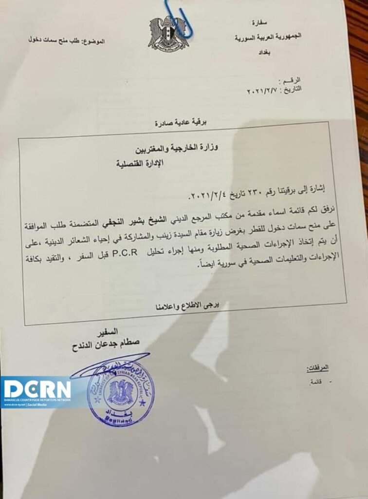 وفي سياق آخر حصلت شبكة مراسلي ريف دمشق على وثيقة تضمنت طلباً وجهته إيران إلى سفارة الأسد لاستقبال المئات من الزوار الشيعة قادمين من مناطق النجف وكربلاء والشيرازي حيث سيقومون بإحياء مناسبات دينية خاصة في المناطق الخاضعة للسيطرة والإدارة الإيرانية، وقد أجابت السفارة على الفور بإرسالها برقية تضمنت الموافقة مع ختم وتوقيع السفير “صطام جدعان الدندح” على استقبال الزوار مع تنبيهه باتباع الإجراءات الصحية اللازمة.
