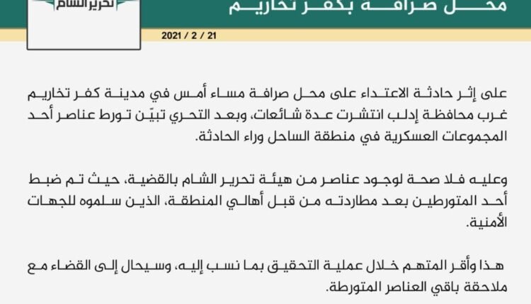 صرح تقي الدين عمر عضو مكتب العلاقات الإعلامية لدى هيئة تحرير الشام في حديث خاص لشبكة مراسلي ريف دمشق “أنه بعد التحري حول حادثة الاعتداء على محل صرافة يوم أمس في مدينة كفر تخاريم غربي محافظة إدلب تبيّن وقوف عناصر تتبع لأحد المجموعات العسكرية في منطقة الساحل وراء هذه الحادثة، حيث تم ضبط أحد المتورطين بعد مطاردته من قبل أهالي المنطقة، الذين سلموه للجهات الأمنية.وقد أقر المتهم خلال عملية التحقيق بما نسب إليه، وسيحال إلى القضاء مع ملاحقة باقي العناصر المتورطة” نافياً الكثير من الشائعات التي انتشرت على وسائل التواصل الاجتماعي.