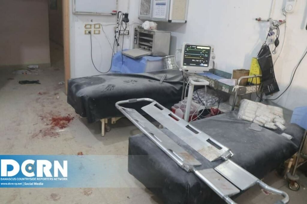 ويشار إلى أن القذائف سقطت أثناء تجمع الأهالي والمرضى على باب المشفى ما أوقع عدد كبير من الجرحى وصل إلى ١٥ شخص على الأقل.