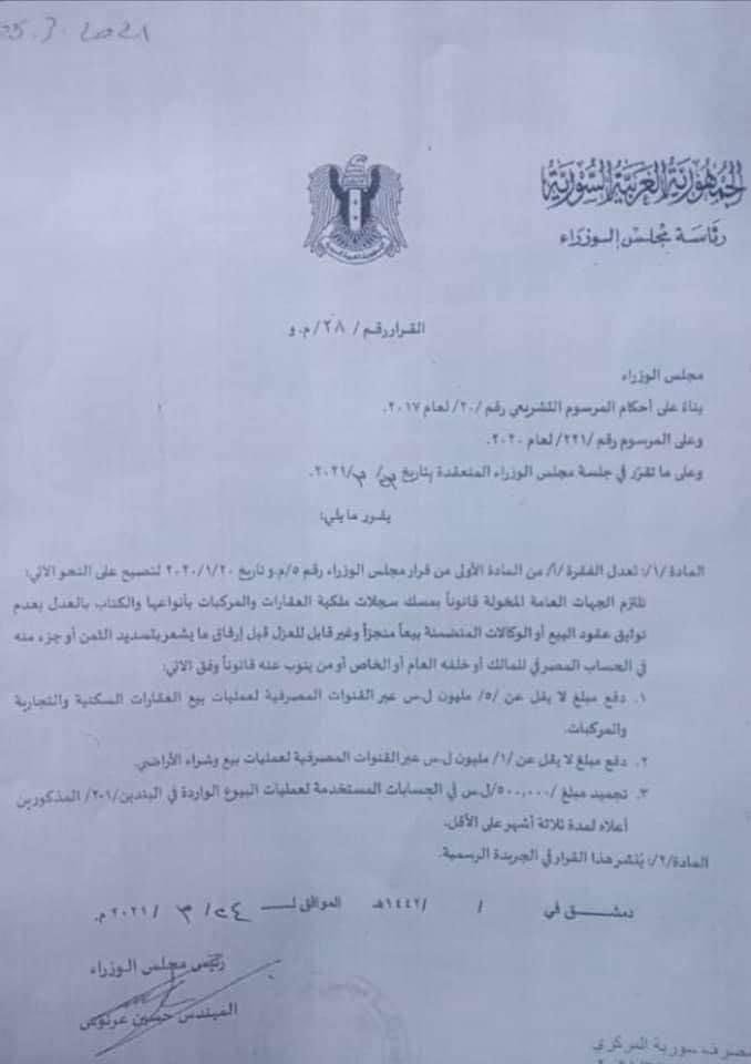 أصدر رئيس مجلس الوزراء لدى حكومة الأسد قراراً يقضي بمنع فراغ أي سيارة أو عقار أو إجراء أي وكالة غير قابلة للعزل بخصوص ذلك قبل إبراز إشعار مصرفي يتضمن تسديد مبلغ “٥ مليون” في حساب المالك أو خلفه الخاص أو وكيله عند فراغ سيارة أو عقار سكني، ومبلغ “١ مليون” عند بيع وشراء الأراضي.