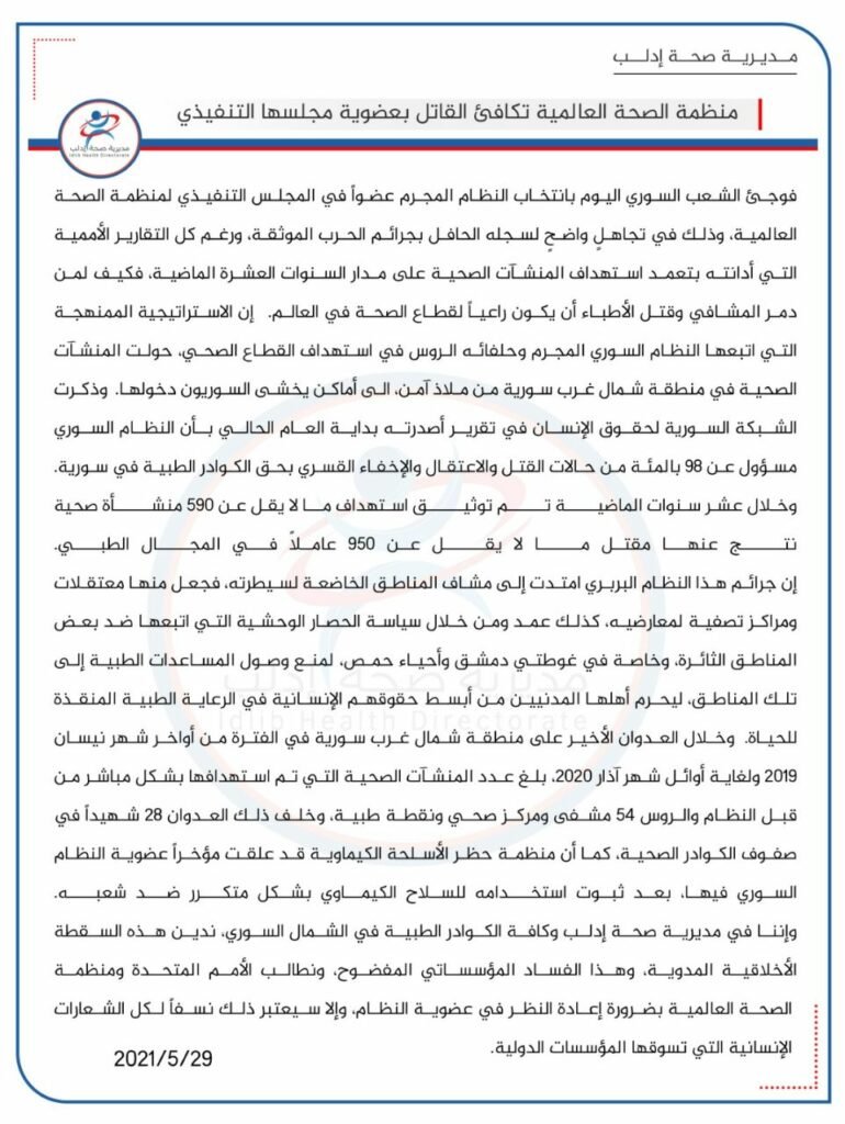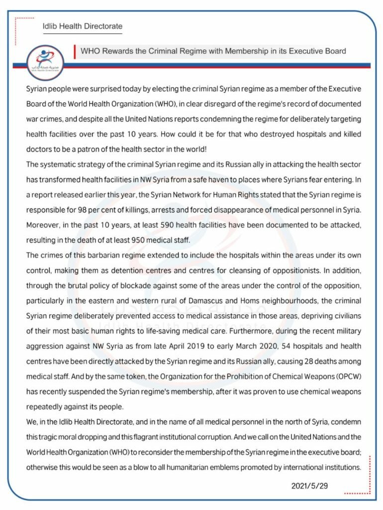 نشرت “مديرية صحة إدلب” يوم أمس على معرفاتها الرسمية في وسائل التواصل الاجتماعي بياناً تفصيلياً حول اعتماد منظمة الصحة العالمية مندوباً عن نظام الأسد، وبحسب البيان الذي نُشر باللغتين العربية والإنجليزية فإن ميليشيات الأسد لم تدّخر أي جهد في قتل السوريين بالاستهداف المتعمد للمشافي والقطاعات الطبية في المناطق الثائرة، إذ تم توثيق استهداف أكثر من 590 منشأة طبية خلال الأعوام العشر الماضية، بالإضافة إلى ارتقاء أكثر من 950 شهيداً من العاملين في القطاع الصحي.