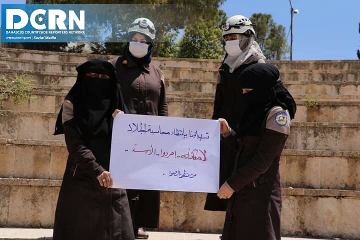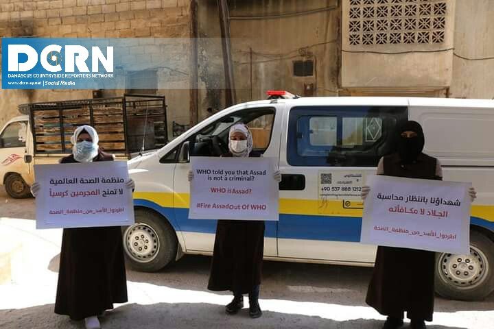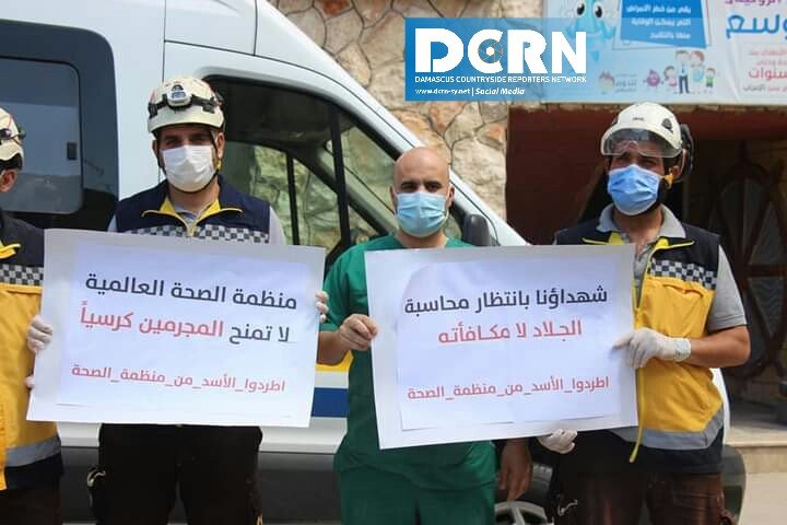 قام عناصر من منظمة الدفاع المدني السوري بوقفة احتجاجية للتنديد بقرار منظمة الصحة العالمية حول قرار اعتماد مندوب للأسد ضمنها بشكل رسمي كممثل عن سوريا، وقد حملت اللافتات عبارات استنكار بسبب إفلات الأسد من العقاب بعد قتله لمئات الآلاف من السوريين وبمختلف الوسائل حتى المحرم دولياً منها، وتأتي هذه الاحتجاجات ضمن حملة أطلقها سوريون على وسائل التواصل الاجتماعي حملت عنوان “اطردوا الأسد من منظمة الصحة”.