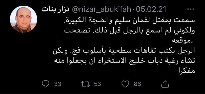 ضجت مواقع التواصل الاجتماعي بخبر مقتل الناشط الفلسطيني “نزار نبات” تحت التعذيب في سجون السلطة الفلسطينية، حيث قالت مصادر أن قوة مسلحة داهمت منزله وقامت بالإعتداء عليه بالضرب، ومن ثم ساقته إلى جهة مجهولة ليتم إشاعة خبر مقتله في اليوم التالي، وقد كانت له العديد من المواقف التي أكد فيها فساد الحكومة الفلسطينية بقيادة محمود عباس، والذي تحدث في آخر مقاطعه المسجلة عن صفقة لقاحات فاسدة أدخلها الإحتلال للمناطق الفلسطينية.