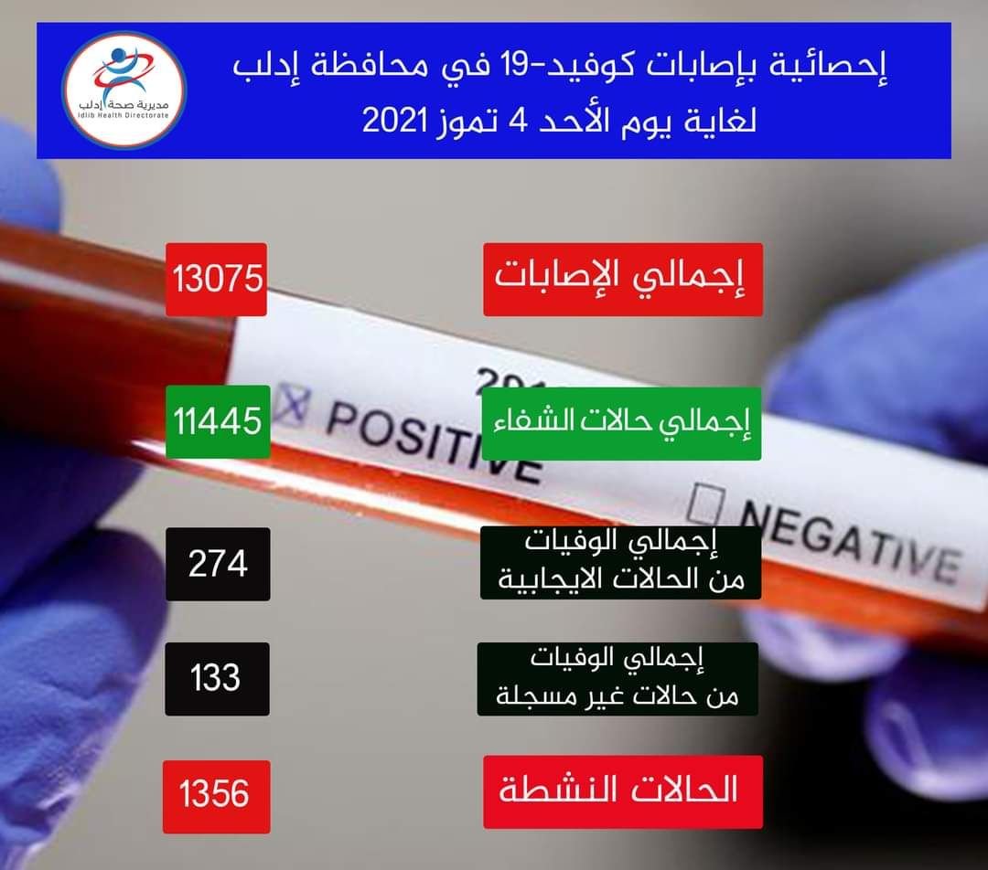 نشرت مديرية الصحة في محافظة إدلب تقريراً إحصائيّاً حول عدد مصابي فايروس كورونا المستجد، حيث رصدت إجمالي المصابين منذ اكتشاف أول الحالات في ال٩ من شهر تموز عام ٢٠٢٠ وحتى ال٤ من تموز عام ٢٠٢١، فقد بلغ العدد ١٣٠٧٥ حالة شُفي منها ١١٤٤٥ حالة، وتوفي منهم ٢٧٤ حالة مسجّلة.