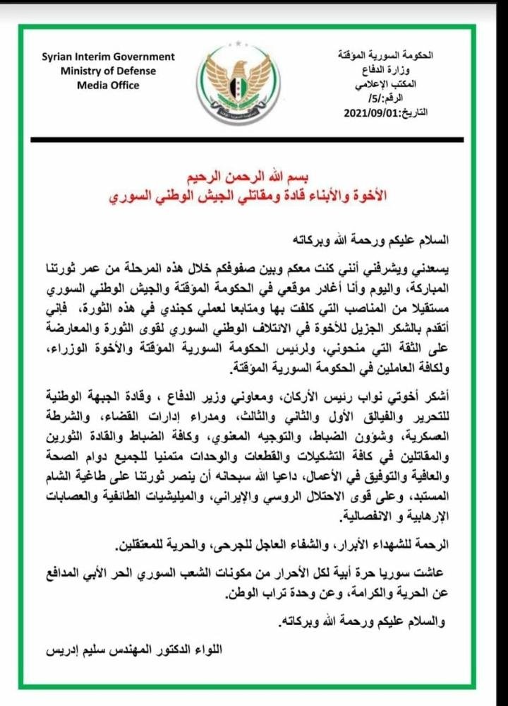 وقال إدريس في بيان استقالته: “يسعدني ويشرفني أنني كنت معكم وبين صفوفكم خلال هذه المرحلة من عمر ثورتنا المباركة، واليوم وأنا أغادر موقعي في الحكومة المؤقتة والجيش الوطني السوري مستقيلاً من المناصب التي كلفت بها، ومتابعاً لعملي كجندي في هذه الثورة”.