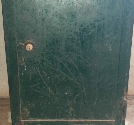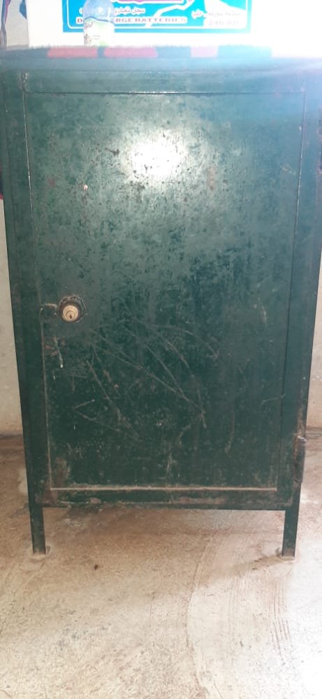 صندوق حديد مطلي باللون الأحمر… وله قفل صغير يتوسط بابه المزخرف بطريقة فنية بديعة.
