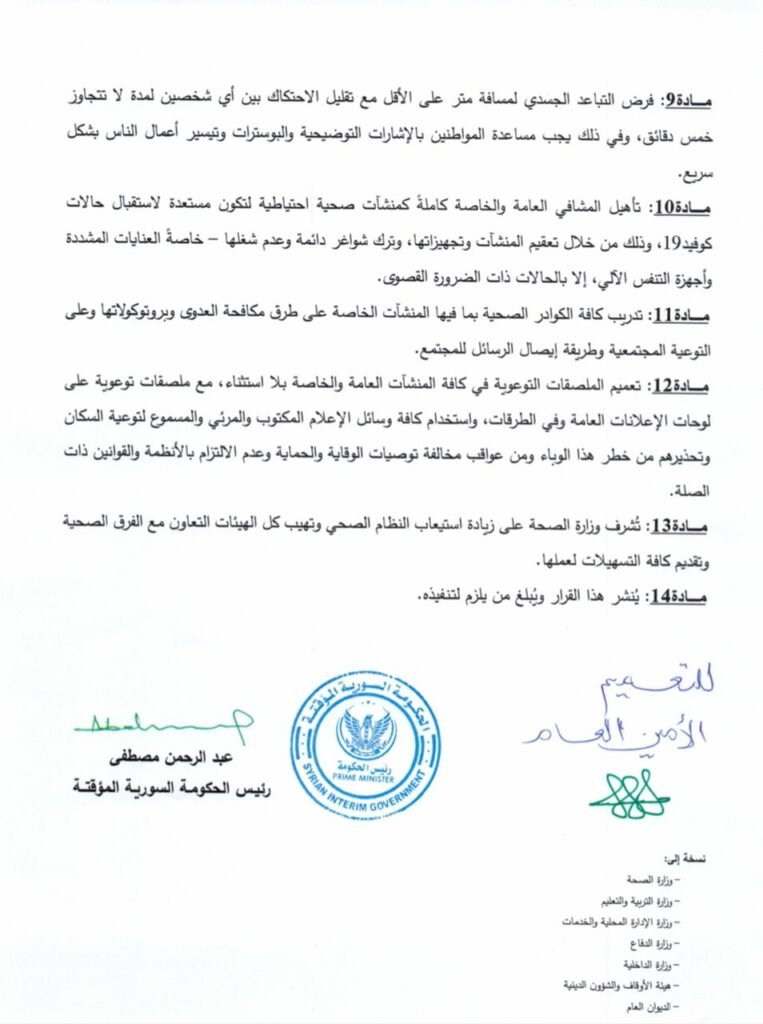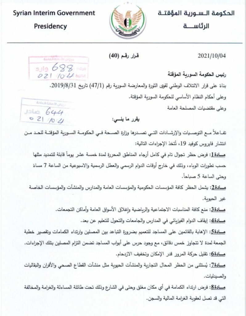 أعلنت الحكومة السورية المؤقتة عن حزمة جديدة من إجراءات الطوارئ من أجل مواجهة انتشار فايروس كورونا، حيث جاء في نص القرار فرض حظر تجوال كامل في عموم مناطق المحرر لمدة 15 يوماً وستكون قابلة للتمديد حسب التطورات التي يفرضها الوباء ويشمل كافة المؤسسات الحيوية والخدمية والحكومية، كما فرض إغلاق المدارس والجامعات والتحول للتعليم عن بعد، واستثنى الحظر المحال التجارية والمؤسسات الحيوية كالأفران والمستشفيات مع الحرص على ارتداء الكمامة الواقية تحت طائلة الغرامة، كما أكد القرار ضرورة الحفاظ على التباعد الإجتماعي وتخفيف الازدحام في الشوارع، وقد جاء هذا القرار عقب حالة من الانهيار في القطاع الصحي نتيجة امتلاء مراكز الحجر الصحي والنقص الحاد في مادة الأوكسجين والارتفاع الكبير في أعداد الحالات المصابة.