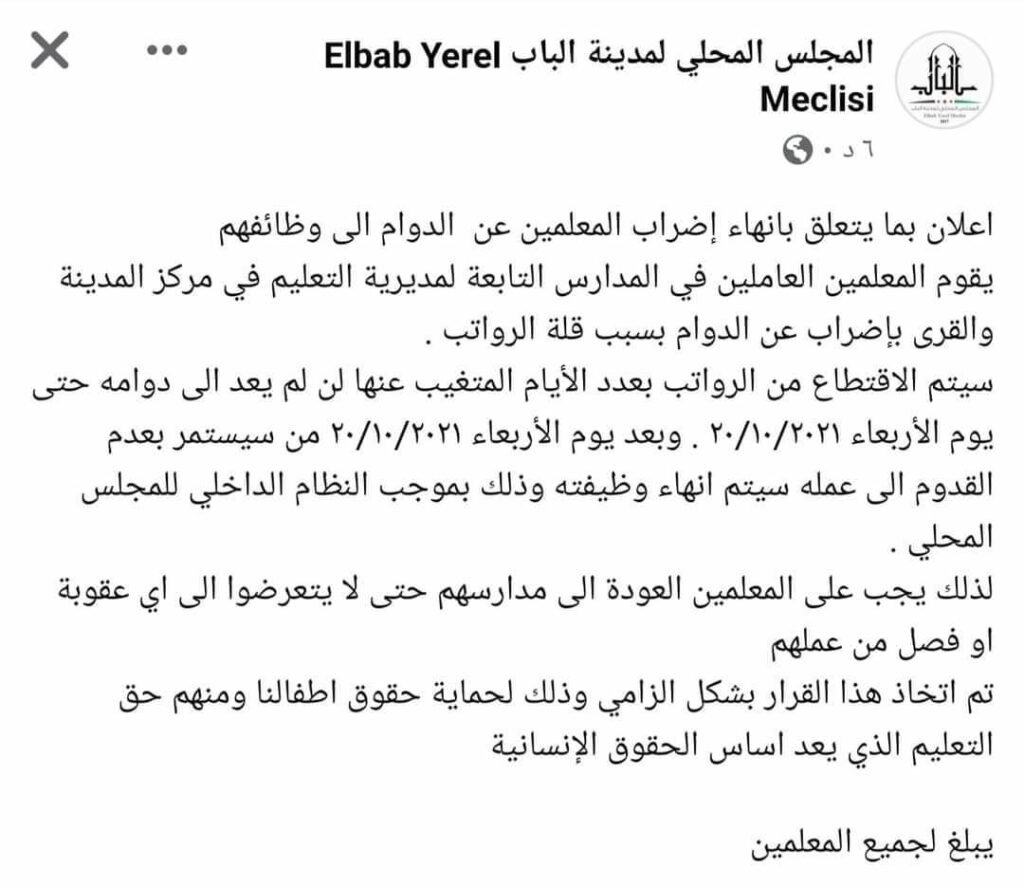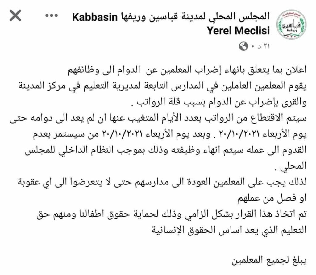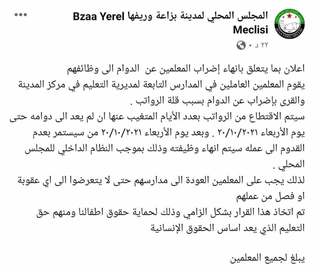 في صياغة واحدة وبأخطاء إملائية كثيرة نشرت صفحات المجالس المحلية لمدن بزاعة والباب وقباسين بياناً طالب المعلمين بإنهاء إضرابهم أو سيتم خصم الأيام التي توقفوا فيها عن الدوام في حال استأنفوا دوامهم قبل يوم الأربعاء من الأسبوع الحالي أو فصلهم من العمل بشكل نهائي عند امتناعهم عن الدوام، فيما يبدو على أنه رد على إضراب المعلمين إحتجاجاً على تردي القطاع التعليمي في الشمال السوري المحرر، حيث طالب المعلمون بزيادة عدد المدارس لاستيعاب أعداد الطلاب الهائلة في ظل وباء كورونا وتحسين رواتبهم بالإضافة إلى السماح بفتح المدارس الخاصة للتخفيف من الازدحام الطلابي على مقاعد الدراسة.