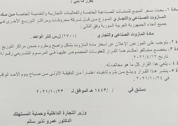 حيث أصدرت اليوم قراراً يقضي بتحديد #سعر مادة المازوت الصناعي والتجاري للمنشآت الصناعية الخاصة والفعاليات التجارية والخدمية الخاصة الموزع من قبل شركة #محروقات ومراكز التوزيع الأخرى في جميع أنحاء سيطرة قوات الأسد ب #١٧٠٠ ليرة سورية لليتر #الواحد.