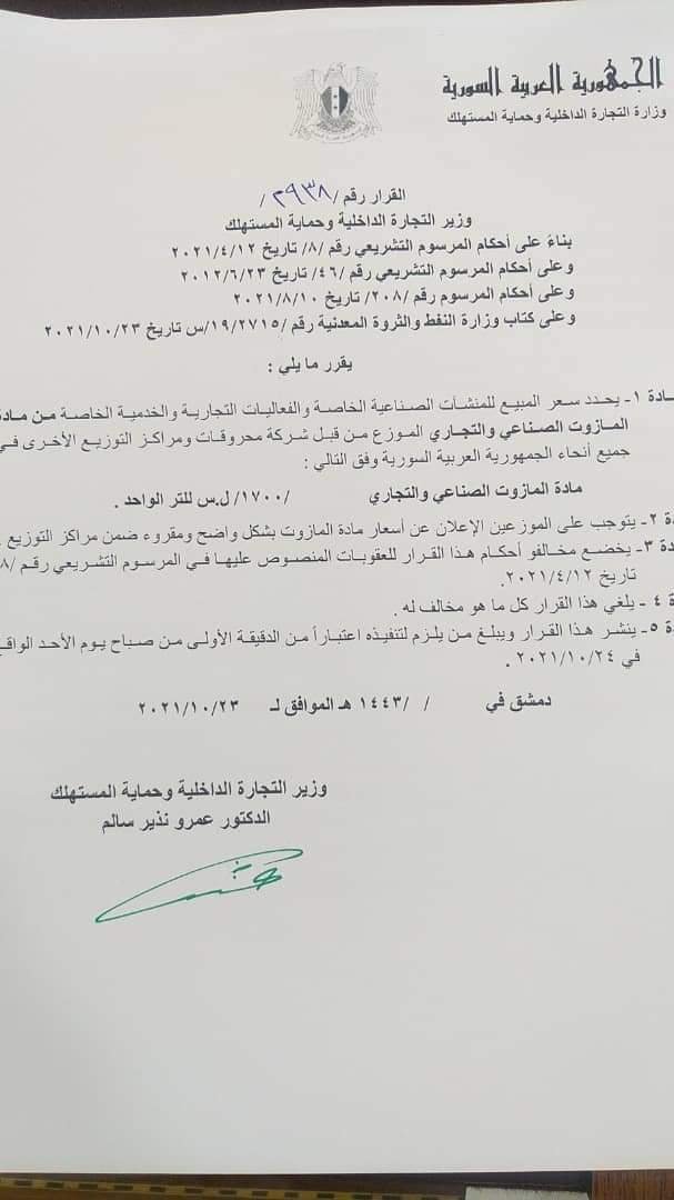حددت وزارة التجارة الداخلية في حكومة الأسد سعر ليتر #المازوت الصناعي والتجاري للمنشآت الصناعية الخاصة والفعاليات التجارية والخدمية الخاصة ب ١٧٠٠ ليرة سورية.