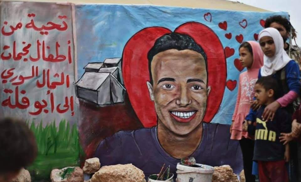 أطفال مخيمات إدلب يقدرون جهود أبو فلة وحملته الإنسانية لتخفيف معاناة المهجرين والنازحين في فصل الشتاء ويرسمون صورته على جدران المخيمات القماشة في معرتمصرين بإدلب شمالي سوريا.