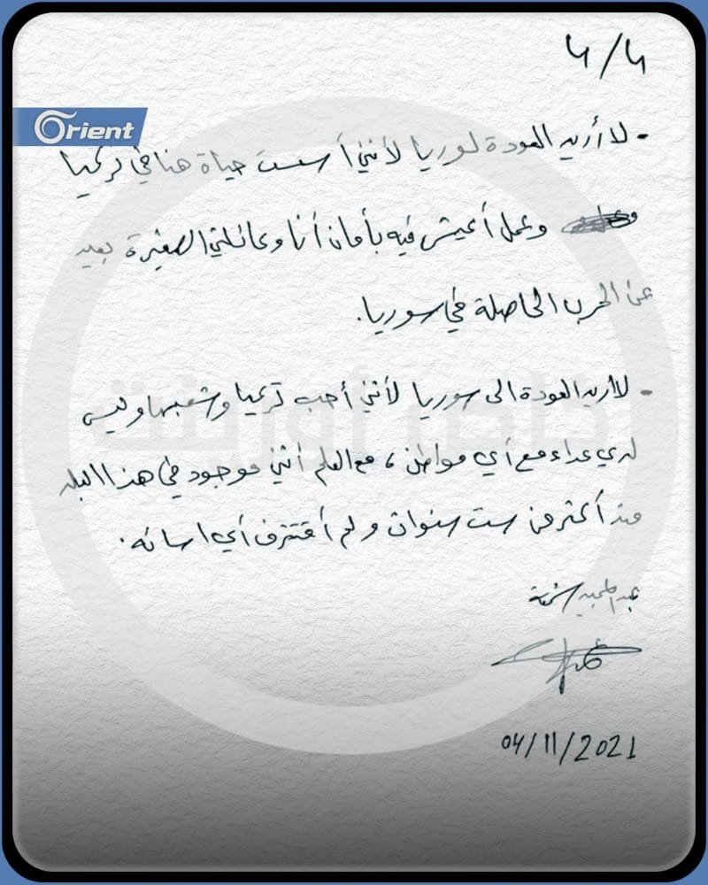 نشرت قناة أورينت رسالة خطية كُتبت بخط يد الإعلامي المعتقل لدى السلطات التركية والمهدد بالترحيل إلى سوريا حيث كتب فيها أنه أُجبر على التوقيع على ورقة الترحيل عن طريق الدفع بقوة والصراخ وأنه لا يكن للشعب التركي إلا الاحترام، ورفض خلال الرسالة العودة إلى سوريا لأنه أسس حياة في تركيا ويعيش فيها مع أسرته منذ 6 سنوات فضلاً عن الخطر الذي يهدد حياته إذ قال: “هناك خوف من جبهة تحرير الشام وبعض الفصائل المسلحة لأنني تحدثت عن اشتباكاتهم في عملي الصحفي وبعض فيديوهاتي المنشورة”، وأكد أنه لم يقترف أي إساءة من شأنها مخالفة القانون التركي.