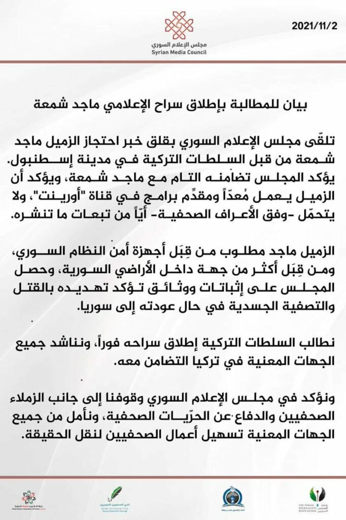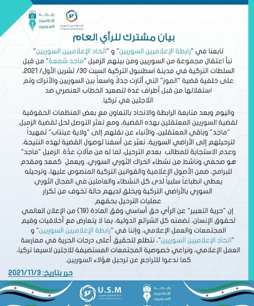 وفي ذات السياق أصدرت عدة اتحادات صحفية عاملة في الشمال السوري بينات تطالب فيها السلطات التركية بوقف عملية ترحيل مقدم البرامج السوري ماجد شمعة والذي تم اعتقاله على إثر إجرائه استطلاع رأي مرئي حول “قضية الموز” التي أثارت الرأي العام التركي، حيث طالب كل من مجلس الإعلام السوري ورابطة الإعلاميين السوريين واتحاد الإعلاميين السوريين بالإفراج عن ماجد شمعة ونوهوا بأنه مطلوب لدى الأفرع الأمنية لنظام الأسد وساهم في تغطية أحداث الثورة إعلامياً، كما نوهوا أيضا على ضرورة احترام السلطات التركية لمسألة حرية التعبير عن الرأي مؤكدين أن شمعة لم يخالف أيّا من قوانين الدولة التركية ولم يخرج عمله عن النطاق المشروع.