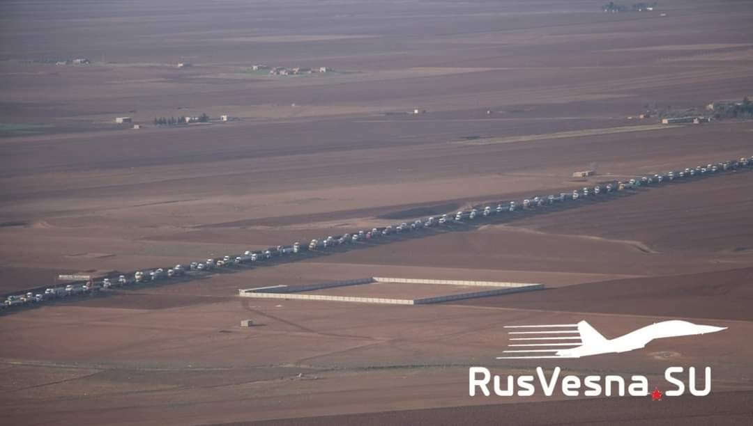 نشرت قناة تابعة للجيش الروسي صورا التقطتها طائرة روسية مسيرة في القامشلي تظهر طابورا طويلا من ناقلات النفط تتحرك نحو العراق.
