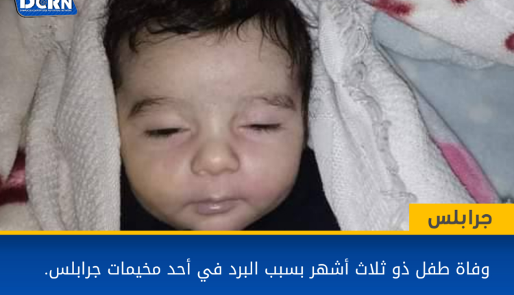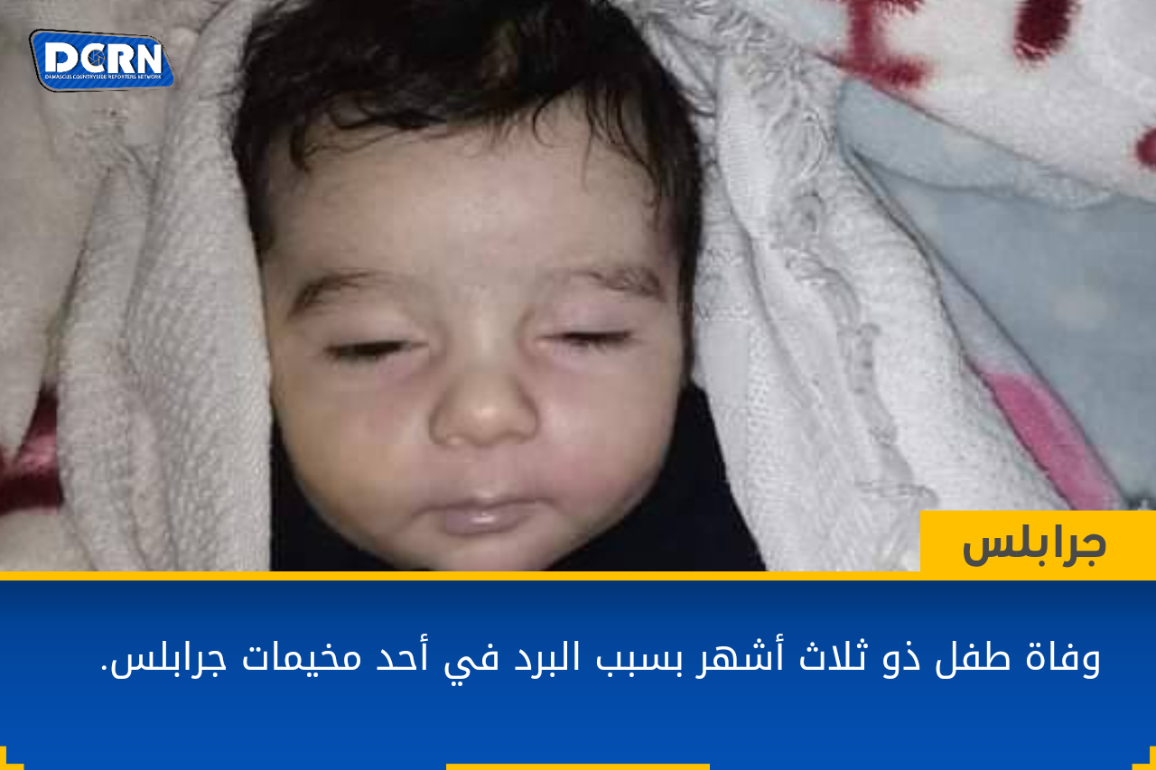 توفي الطفل “صلاح مهند جنيد” أحد مهجري حمص من حي الوعر في مخيم زوغرة ب #جرابلس بسبب ذبحة صدرية نتيجة البرد في ظل العاصفة الثلجية على الشمال السوري. يذكر أن الطفل تم إسعافه إلى المركز الصحي في مخيم زوغرة، لكنه كان قد فارق الحياة قبل ساعة من وصوله المركز، ولم تُجدِ محاولات الفريق الطبي بإنقاذه سواء بالإنعاش أو تقديم الإسعافات اللازمة.