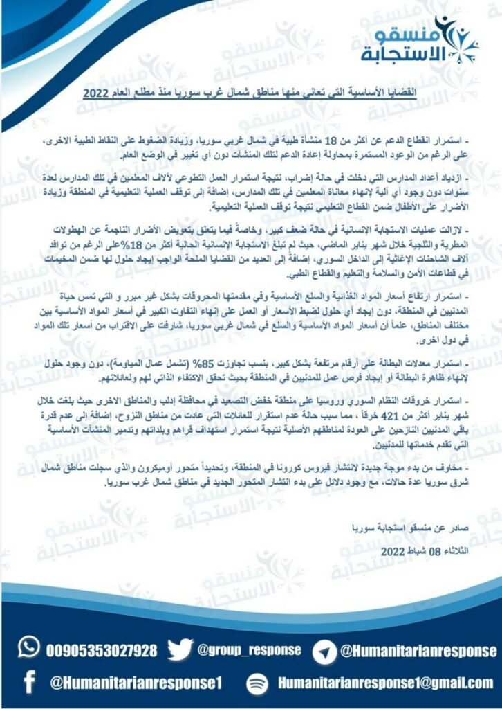 نشر فريق منسقي استجابة سوريا بياناً تفصيلياً حول القضايا الأساسية التي يعاني منها الشمال السوري المحرر في الوقت الحالي، حيث نوهت إلى استمرار قطع الدعم عن 18 مشفى ما يزيد الضغوط على المشافي المتبقية، وسط جهود حثيثة لمحاولة إعادة الدعم، بالإضافة إلى ضعف عملية الاستجابة الإنسانية بتعويض الأضرار الناجمة عن الهطولات المطرية والثلجية، وأشارت إلى أن الدعم المقدم لا يكفي سوى 18 ٪ على الرغم من توافد آلاف الشاحنات الإغاثية الوافدة للداخل السوري كما جاء في البيان.