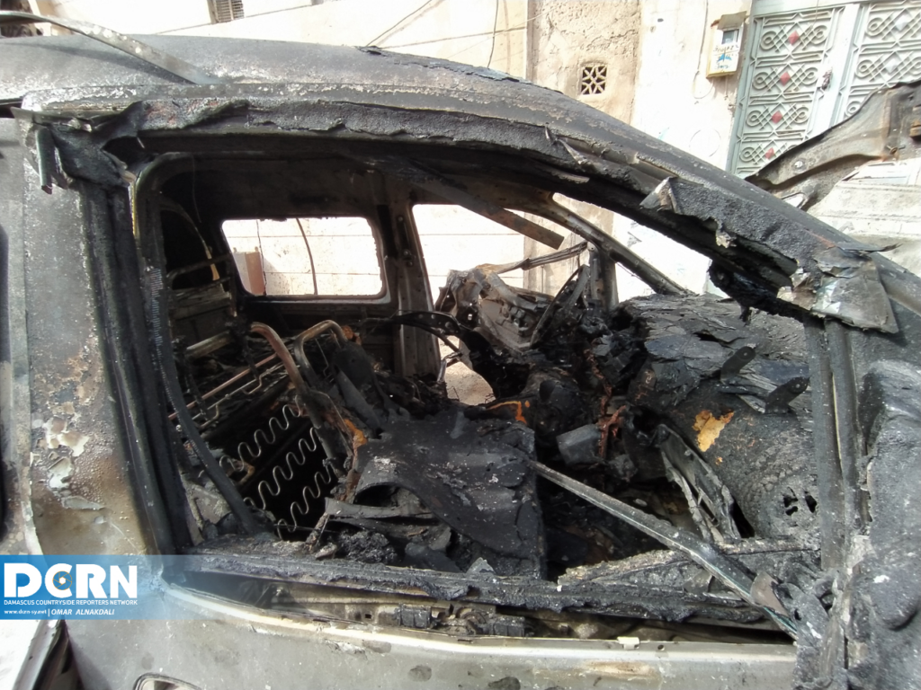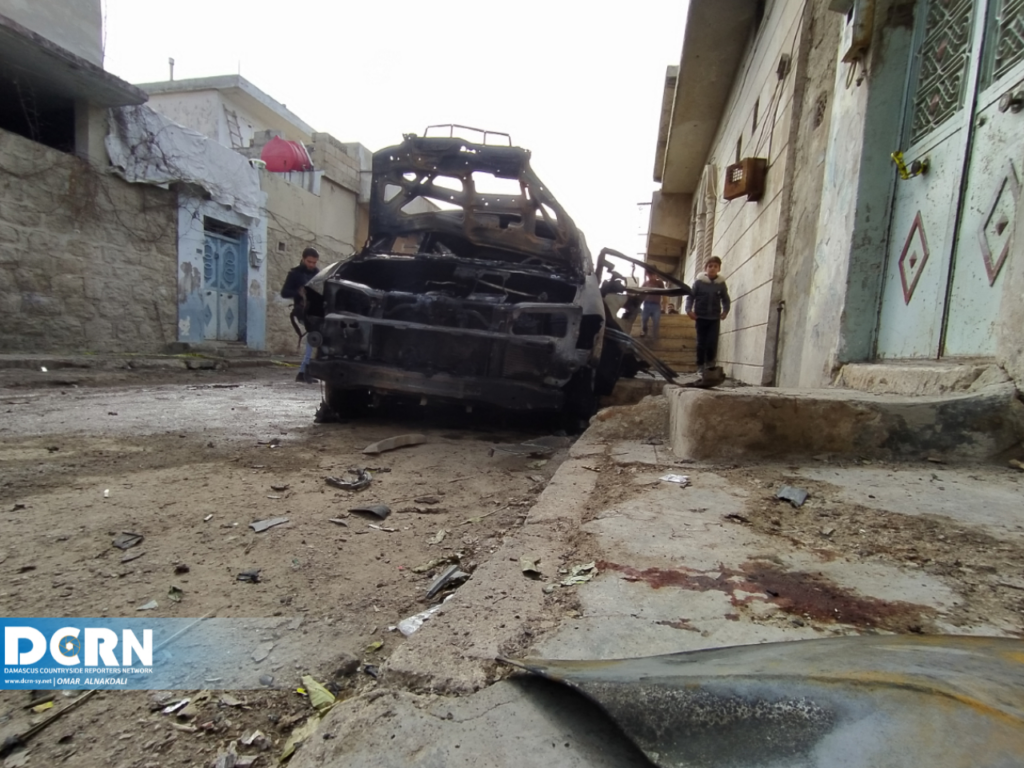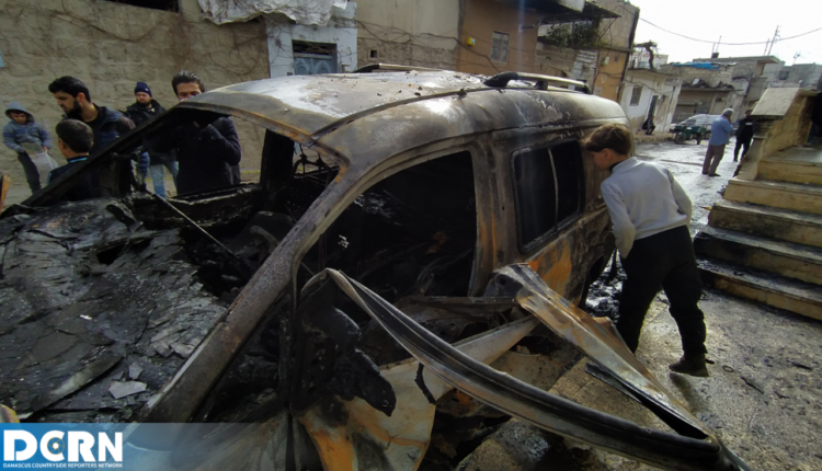 جانب من الدمار الذي خلفه انفجار العبوة الناسفة في مدينة اعزاز وأسفر عن مقتل عنصر من الجيش الوطني السوري