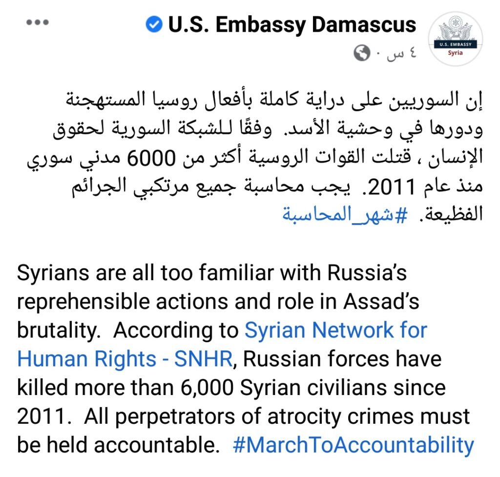 أشادت الصفحة الرسمية للسفارة الأمريكية في دمشق عبر منشور لها على صفحتها الرسمية في فيس بوك بدور النساء السوريات اللواتي شاركن في التظاهرات السلمية ضد نظام الأسد، ووجهت شكراً للهيئة السورية للتفاوض والاتحاد الأوروبي، كما قالت في منشور آخر إن السوريين على دراية تامة بأفعال روسيا التي وصفتها بـ”المستهجنة” والتي كانت سبباً بوحشية الأسد ضد المدنيين، حيث نقلت إحصائية للشبكة السورية لحقوق الإنسان والتي جاء فيها إن أكثر من 6000 آلاف مدني قد قُتلوا على يد القوات الروسية منذ عام 2011، وختمت بتأكيدها على ضرورة محاسبة جميع مرتكبي الجرائم.