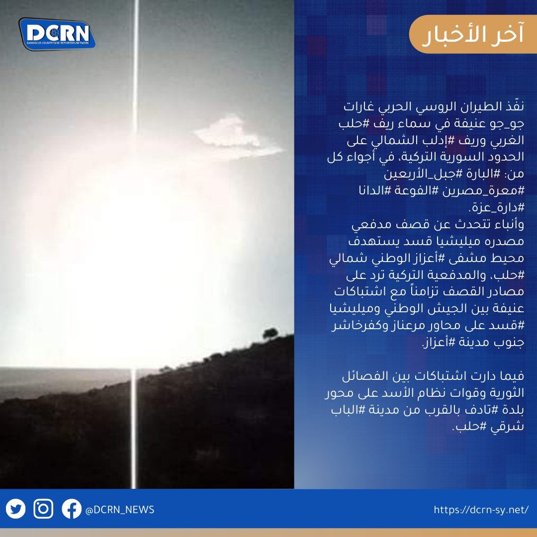 نفّذ الطيران الروسي الحربي غارات جوجو عنيفة في سماء ريف #حلب الغربي والشمالي وريف #إدلب الشمالي على الحدود السورية التركية، في أجواء كل من: #البارة #جبلالأربعين #معرةمصرين #الفوعة #الدانا #دارةعزة #ريف_عفرين