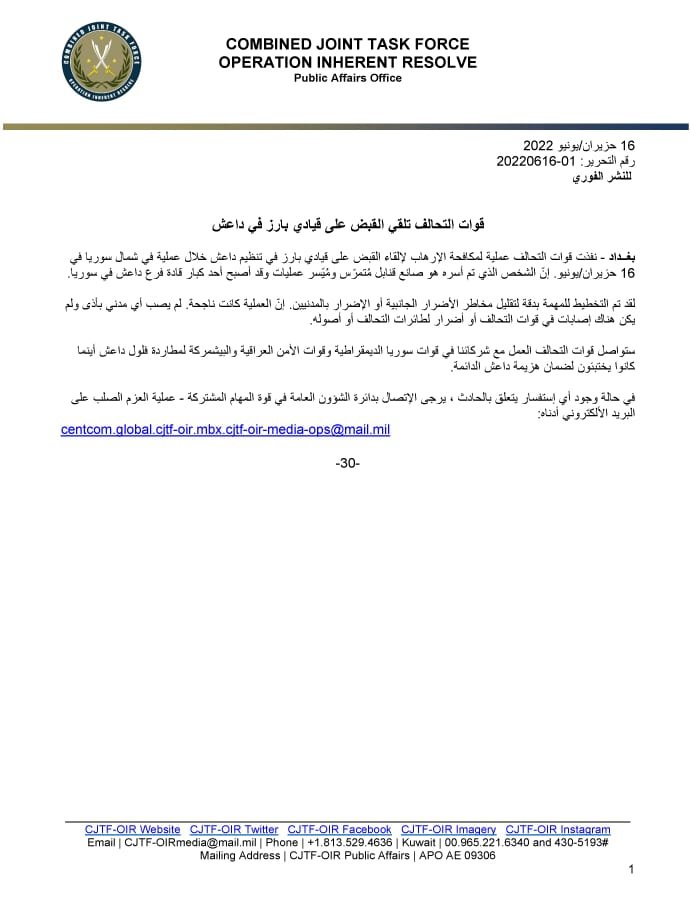 أصدر التحالف الدولي بياناً أعلن فيه عن نتائج عملية الإنزال التي نفذها في منطقة جرابلس يوم أمس، حيث جاء في البيان إن العملية هدفت للقبض على قيادي بارز في تنظيم داعش، ووفق التفاصيل فإن التخطيط للعملية تم بدقة وتمت بنجاح دون إصابة مدنيين أو في القوات المشاركة وطائراته.
