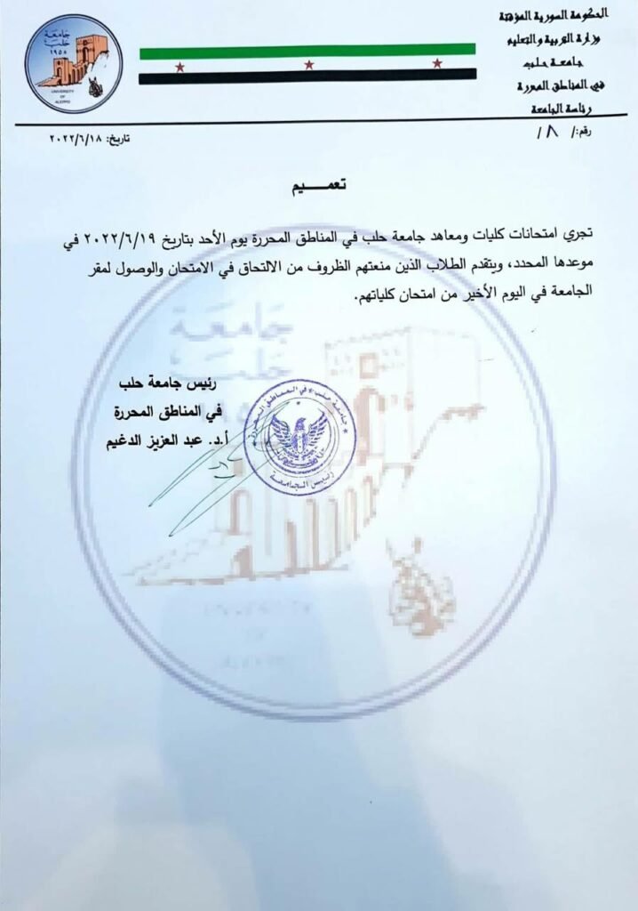 وفي ذات السياق فقد أصدرت جامعة شام قراراً بتأجيل الامتحانات التي كانت من المفترض أن تُقام يوم الأحد إلى تاريخ بتم تحديده لاحقاً، بالإضافة لقرار أصدرته جامعة حلب في المناطق المحررة والذي يقضي بإقامة الامتحانات يوم الأحد مع منح الطلاب الذين منعتهم التوترات من الوصول للجامعة فرصة تقديم الإمتحانات في اليوم الأخير من امتحان كلياتهم