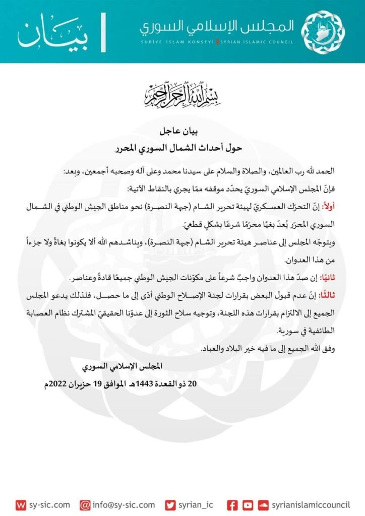وزارة الدفاع في الحكومة السورية المؤقتة أصدرت بياناً نوهت فيه على ضرورة الإحتكام لقرارات اللجنة الوطنية للإصلاح والإبتعاد عن الإحتكام للسلاح ورفض الإستعانة بأطراف من خارج المؤسسة العسكرية لتنفيذ أجندات غير ثورية، تزامن ذلك مع إصدار المجلس الإسلامي السوري بياناً اعتبر فيه التحرك العسكري لهيئة تحرير الشام نحو مناطق الجيش الوطني السوري محرماً بشكل قاطع وطالب جميع مقاتلي هيئة تحرير الشام أن لا يكونوا جزءً من هذه التوترات، وأكد أن صد الهجمات نحو مناطق الجيش الوطني واجب شرعي على جميع القادة والعناصر، وختم المجلس بضرورة توجيه سلاح الثورة نحو نظام الأسد بوصفه عدو السوريين الوحيد والمشترك.