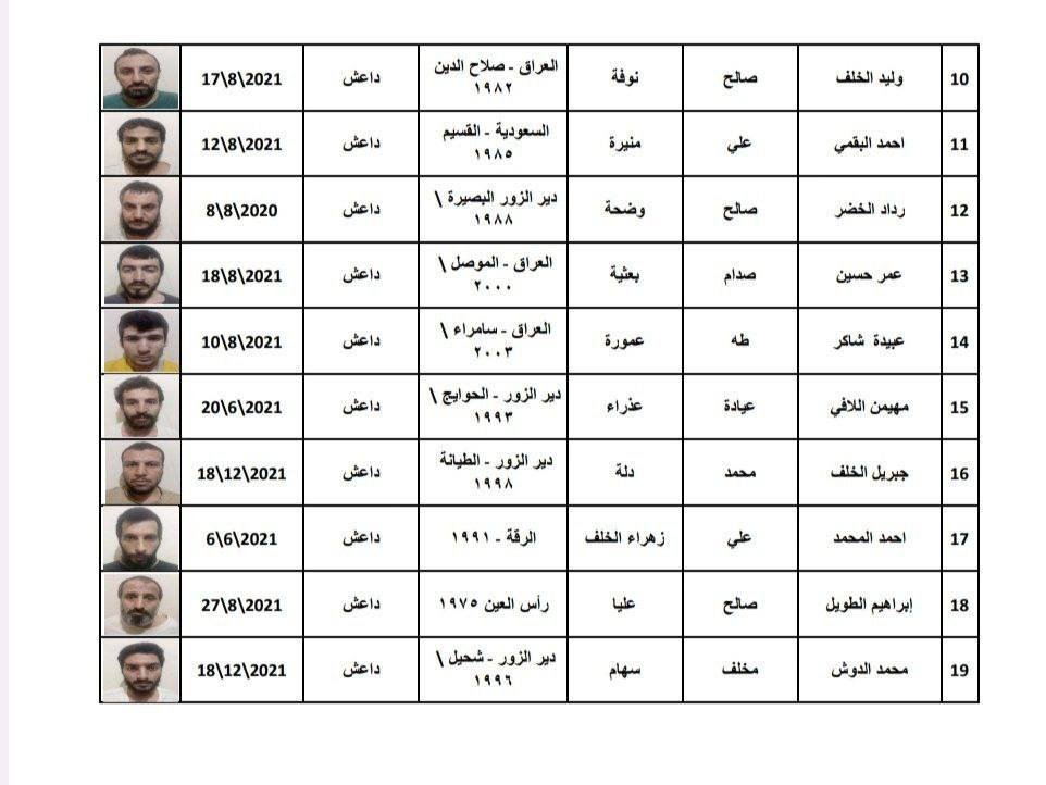 وقد أظهرت قوائم تم تداولها أسماء وصور الموقوفين الهاربين وبينهم سجناء من الجنسيتين السعودية والعراقية إضافة إلى الجنسية السورية وقد ثبت تعاملهم مع التنظيم من خلال تحقيقات سابقة.