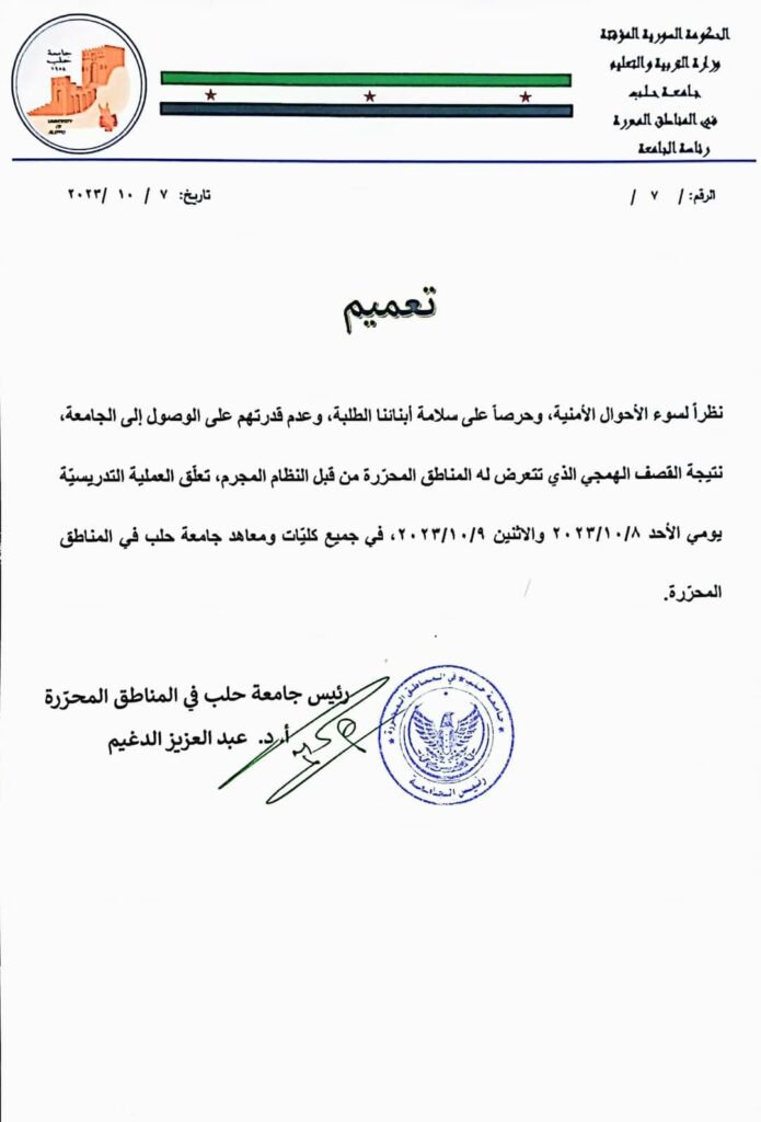 أعلنت وزارة التعليم العالي لدى حكومة الإنقاذ عن تعليق الدوام في كل من الجامعات الخاصة إلى يوم الخميس القادم، كما أصدرت جامعة حلب الحرة بياناً بتعليق العملية الدراسية في جميع المعاهد والكليات التابعة للجامعة يومي الأحد والإثنين.