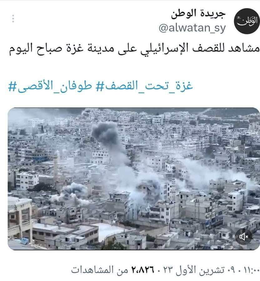 نظام الأسد اعتمد في نشره للصورة على منشور للناطق باسم جيش الكيان الصهيوني “أفيخاي أدرعي” والذي نشر الصورة قائلاً إنها من عملية “السيوف الحديدية” التي أطلقها الكيان ضد القطاع.