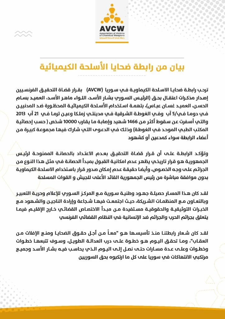 رحّبت رابطة ضحايا الاسلحة الكيماوية في سوريا ( AVCW) بقرار قضاة التحقيق الفرنسيين إصدار مذكرات توقيف بحق (الرئيس السوري بشار الأسد، اللواء ماهر الأسد، العميد بسام الحسن، العميد غسان عباس)، بتهمة استخدام الأسلحة الكيميائية المحظورة ضد المدنيين في دوما في/5 آب وفي الغوطة الشرقية في منطقتي زملكا وعين ترما في 21 آب 2013 والتي أسفرت عن سقوط أكثر من 1466 شهيد وإصابة ما يقارب 10000 شخص ( حسب إحصائية المكتب الطبي الموحد في الغوطة) وذلك في الدعوى التي شارك فيها مجموعة كبيرة من أعضاء الرابطة سواء كمدعين أو كشهود.