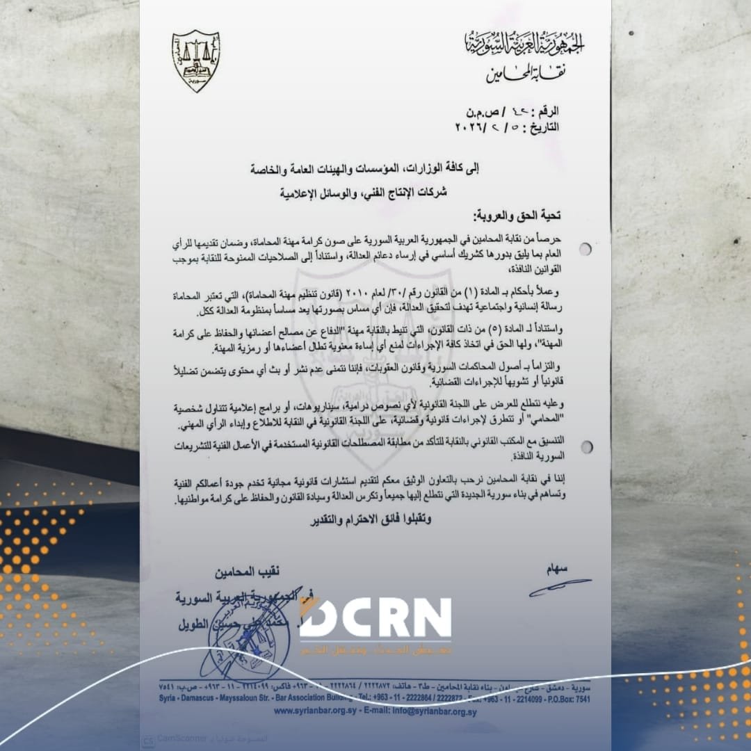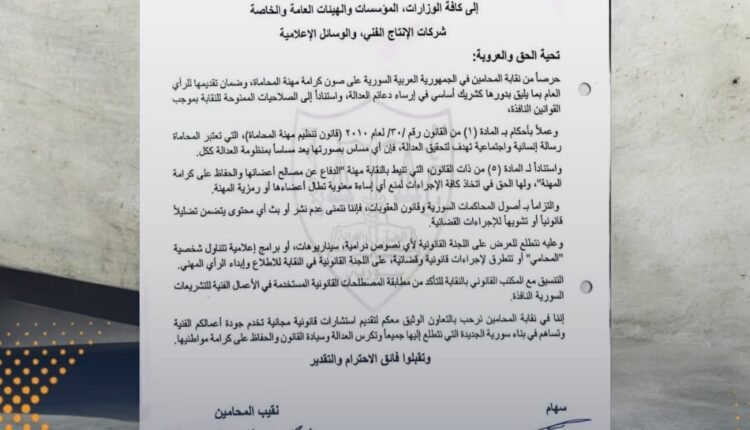 أصدرت نقابة المحامين في الجمهورية العربية السورية توجيهاً رسمياً لكافة الجهات الإعلامية وشركات الإنتاج الفني، طالبت فيه بالتعاون معها قبل إنتاج أو نشر أي مادة تتناول مهنة المحاماة أو الإجراءات القضائية.